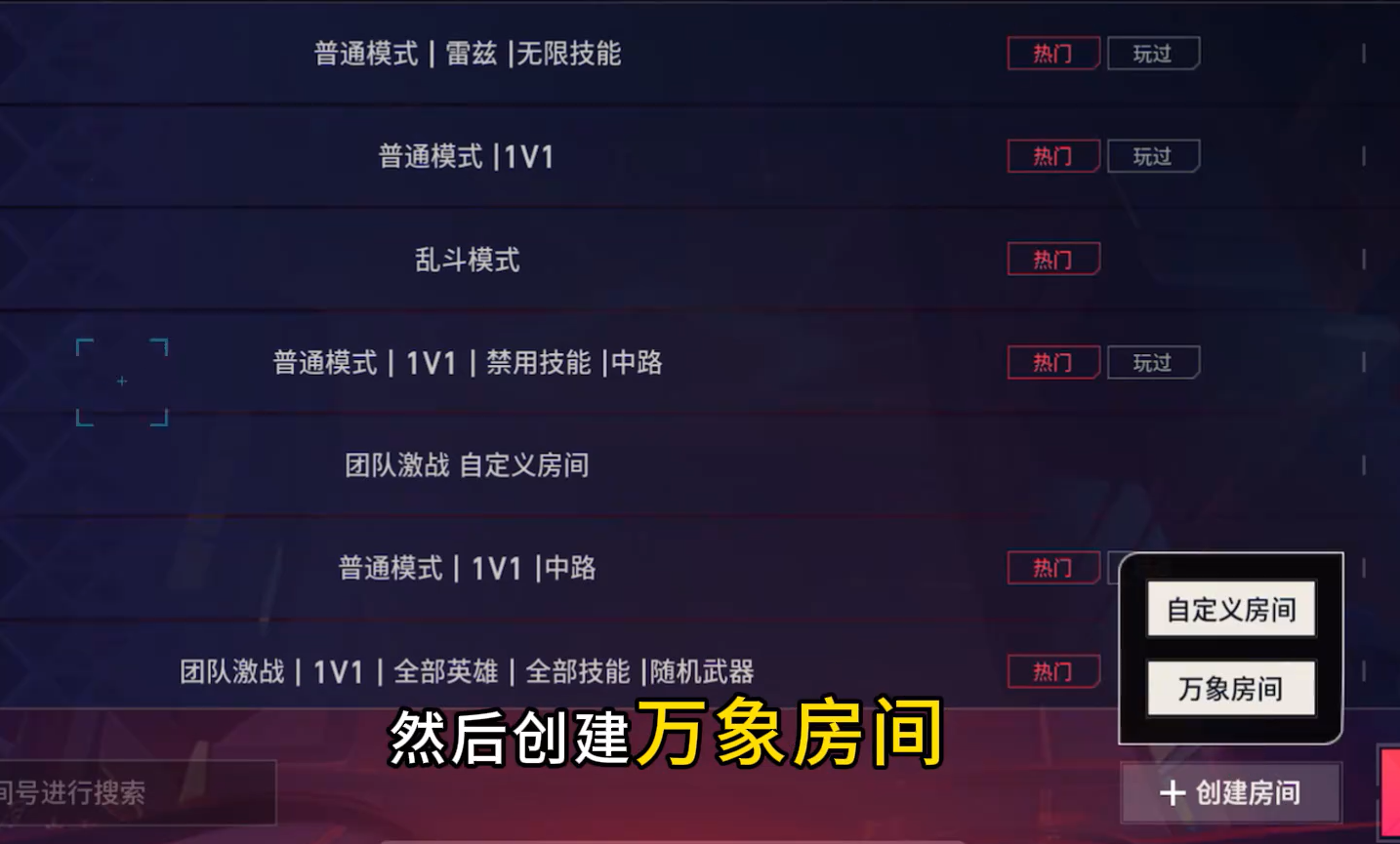 2、接着点击【创建房间】,可以看到自定义房间和万象房间,这里选择万象房间