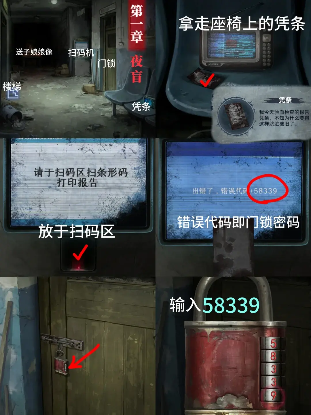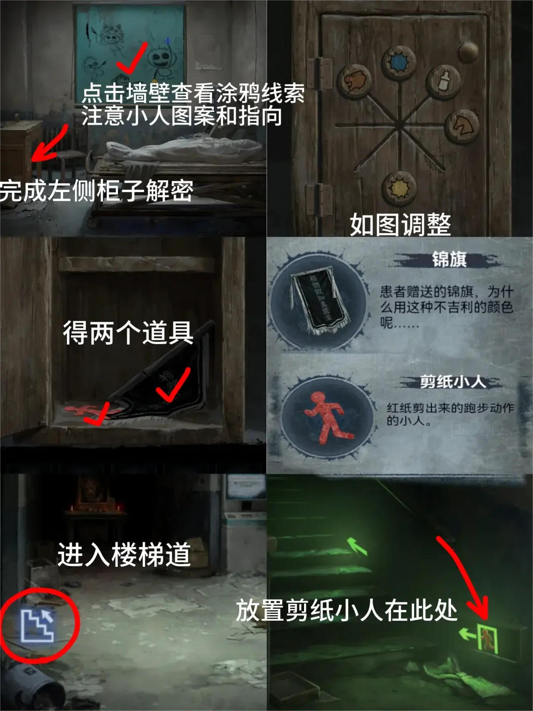 3、回走廊触发盲老太,点左边上楼标识将【剪纸小人】放在安全出口上,上楼