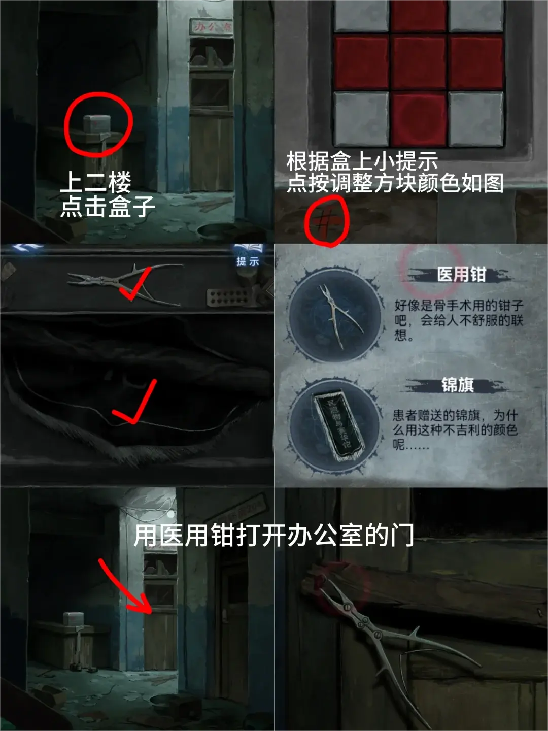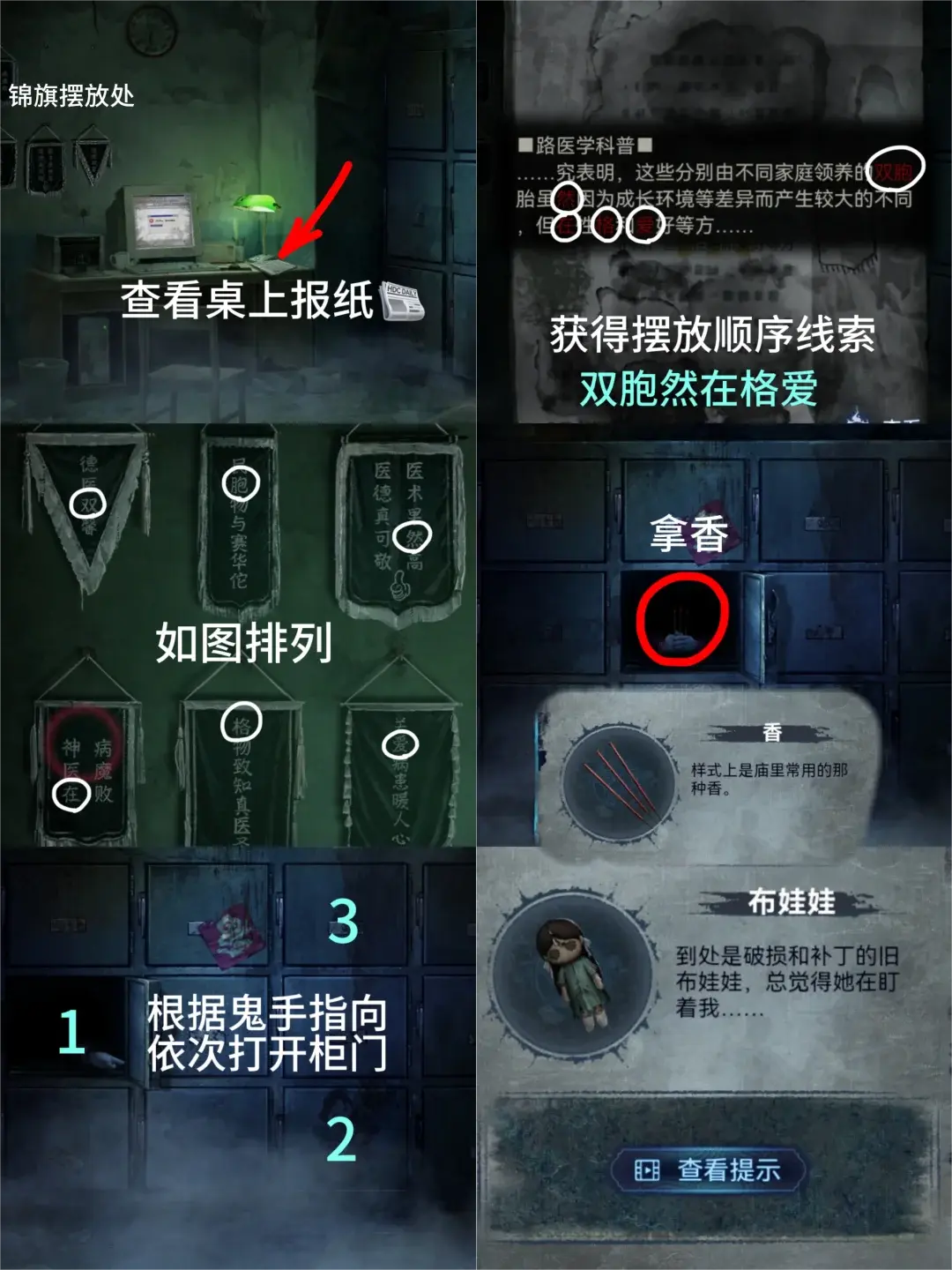 5、【医用钳】撬开右侧办公室门进屋,将两面【锦旗】挂墙上,根据桌上科普标注的字得到锦旗顺序【双胞然在格爱】,找到有对应字的锦旗排序打开停尸柜得到【三炷香】,再根据手指方向依次开柜得到【布娃娃】