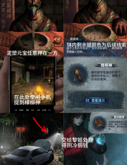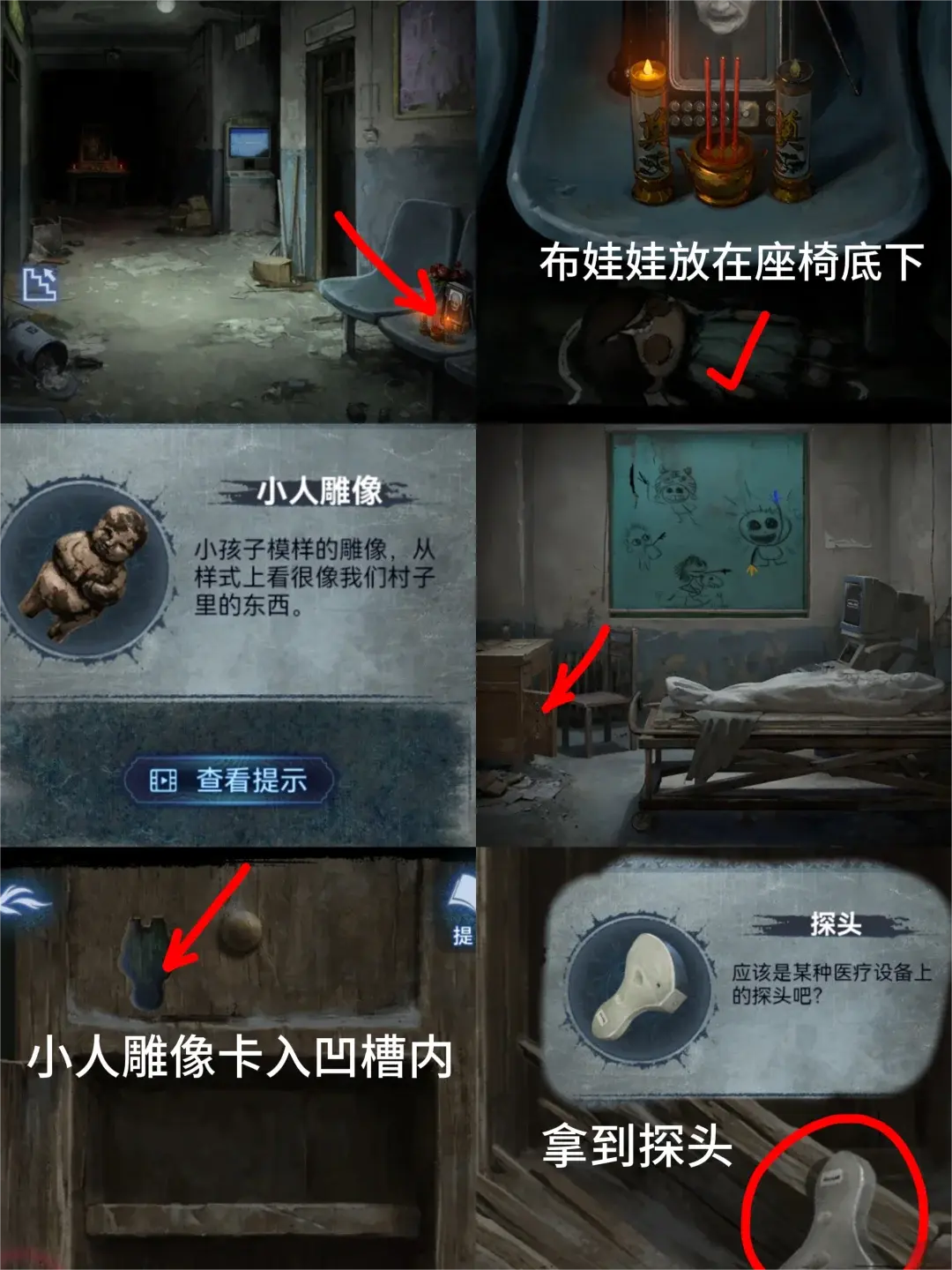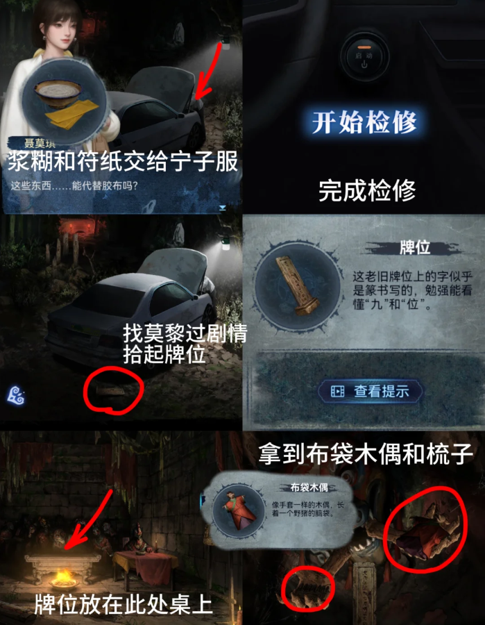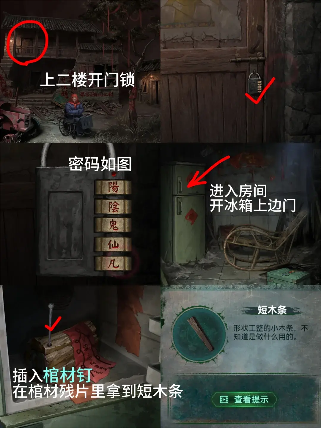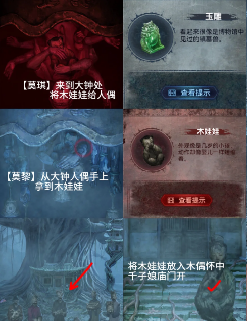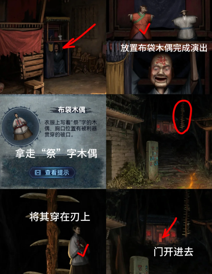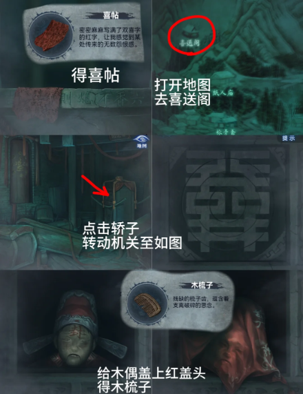 14、回弃煞牢,将【铁枝木偶】放在拿铁棍的木偶师桌上幕布下降将木梳放上去得到牲畜线索【虎4猪6羊7】拖动木屋兽首链条到对应横线获得【阴寒的水】递给宁子服,离开(高能)