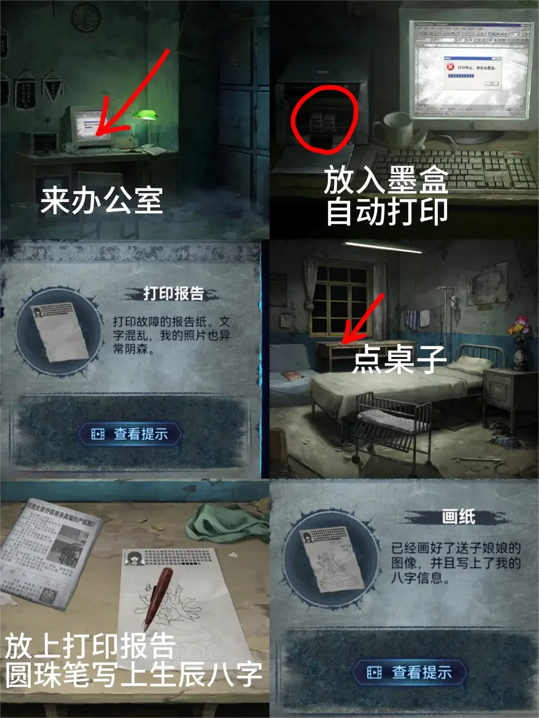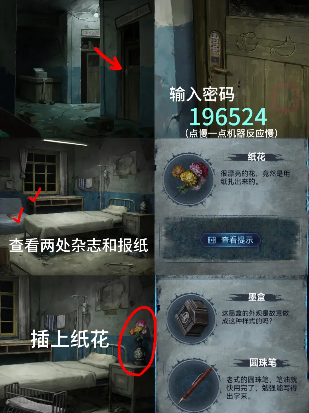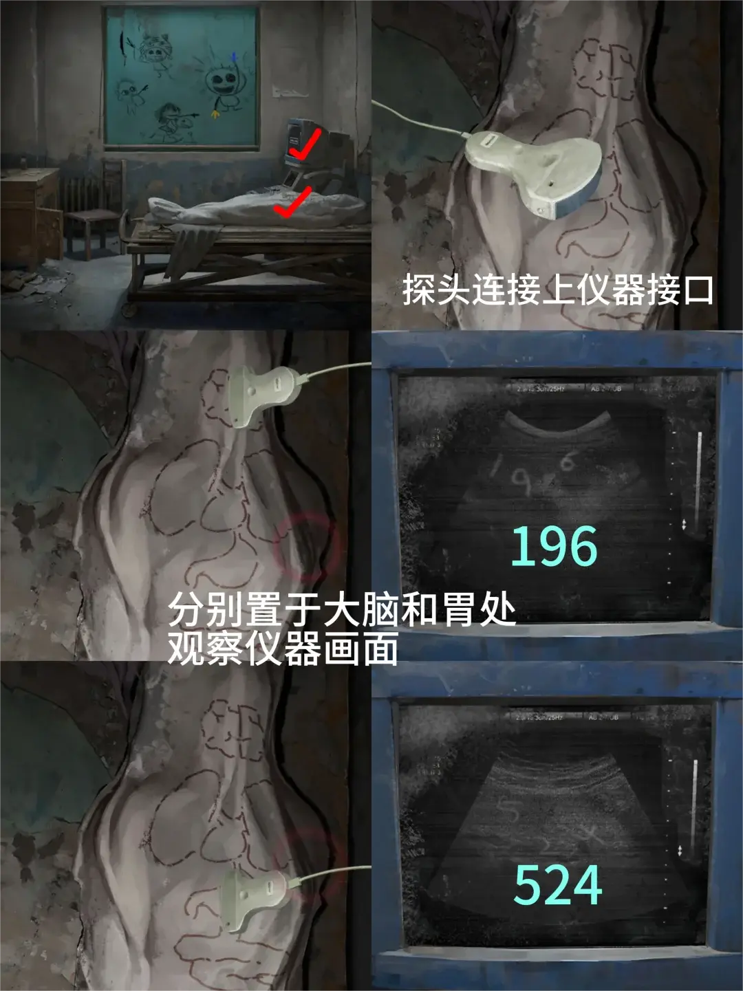 6、回一楼将【布娃娃】放在遗照下方地上得到【小人雕像】,去检查室打开桌子上方抽屉得到【探头】并安在检查床左侧线上,根据二楼病房门提示拖动探头到【脑子和胃】得到密码【196524】打开二楼病房
