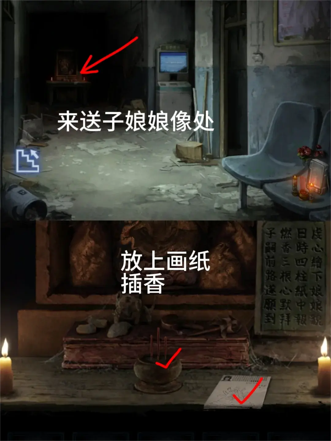 10、回一楼佛龛放上【香】【画像纸】触发石像被发现写了假八字,用【圆珠笔】重写一次(微恐转高能)