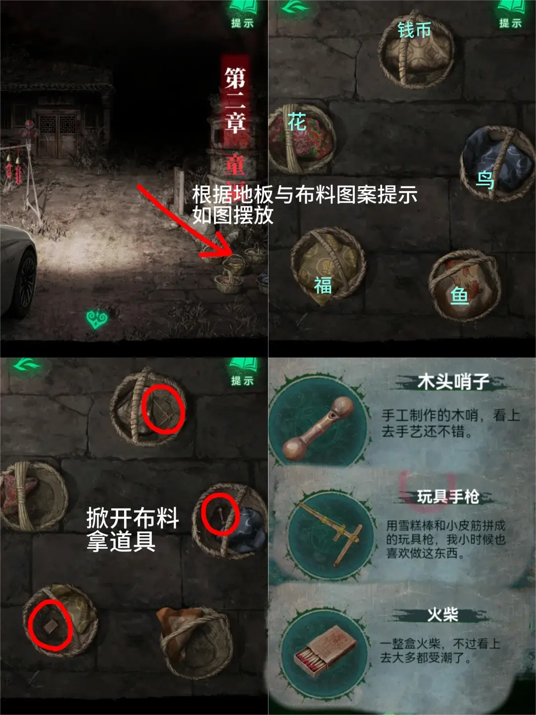 1、点右侧竹筐,对照布和地上图案摆好,点开五个筐获得【玩具手枪】、【木头哨子】、【火柴】
