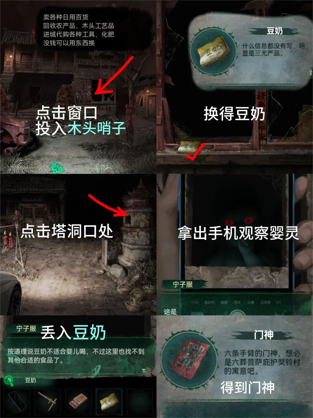 2、手机照旁边塔里看到一个吸手指的婴儿(微恐),进村到商店把【木头哨子】扔进去得到【豆奶】,回村口把【豆奶】扔进塔里得到【门神】
