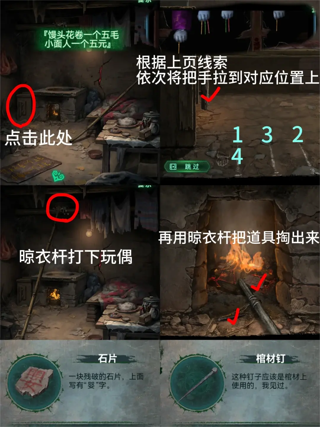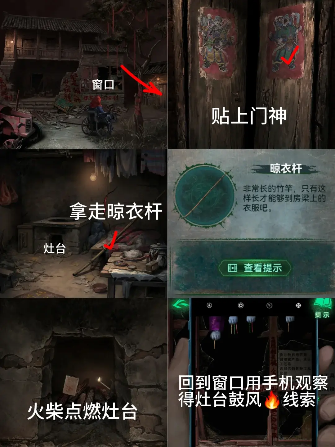 3、回村点右侧房门贴上【门神】开门,进屋拿到【晾衣杆】,【火柴】点燃灶台,用手机照商店窗口得到拉风箱顺序【1321】,【晾衣杆】将灶台上方娃娃打下来(微恐),得到【石片】、【棺材钉】