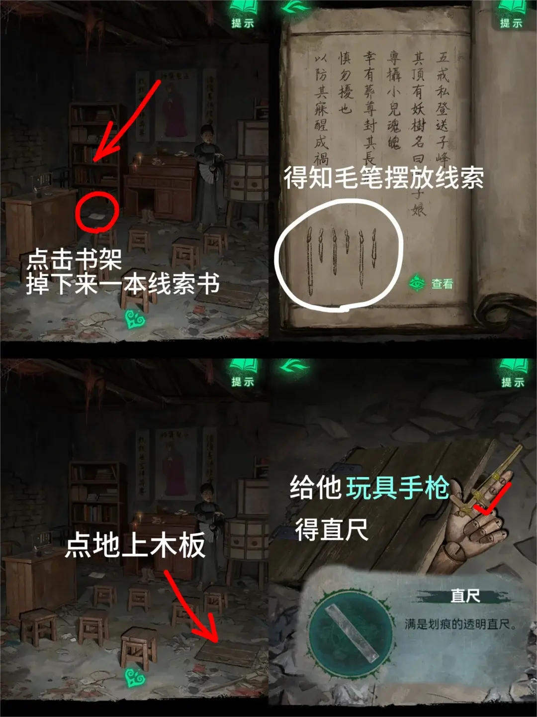 11、地图进称骨斋,将【陶瓷娃娃】放在称骨秤上得到【纸扎剑】【长命锁】,将【纸扎剑】放在右边桌上进入小游戏,根据左侧书架书本提示摆放顺序【天-糕点、鬼-剑、地-糖葫芦、人-陀螺】得到【玩具枪】