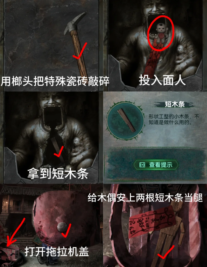 11、回院子点左边拖拉机盖子打开将【短木条】安木头人腿上破魅