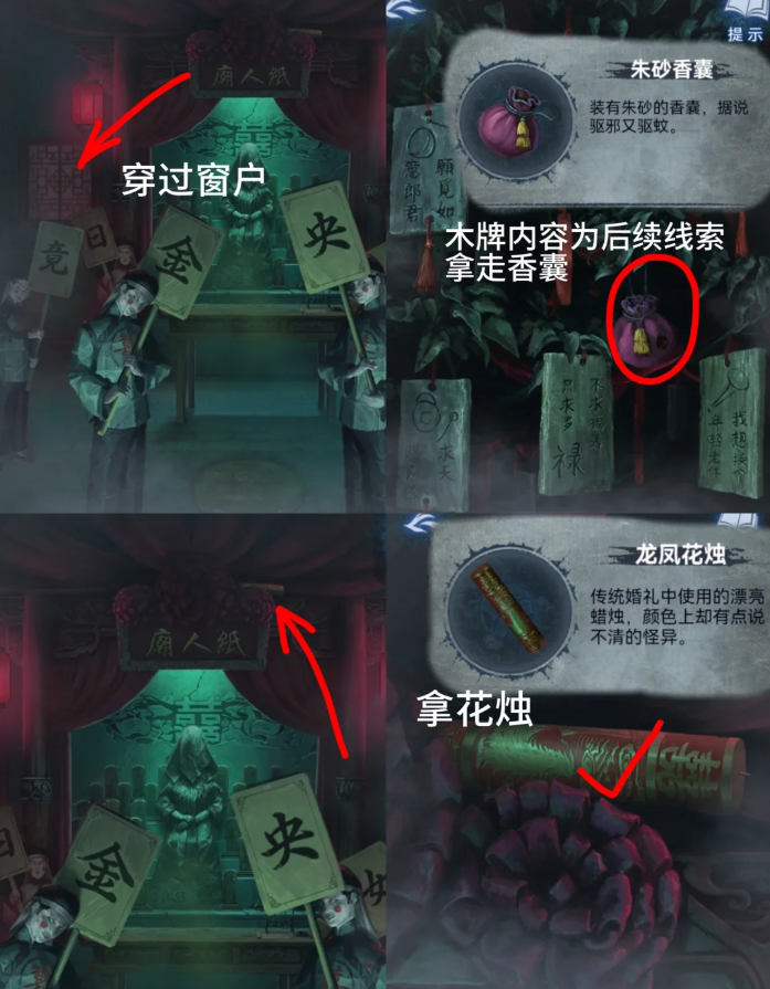 3、地图进六礼轩,拿到【纸扎剪刀】,点左上角悬挂的轿子,将【龙凤花烛】放上去,花到左边得到墙上提示【蜡烛亮为奠,灭为喜】,根据轿子对联提示从左到右依次为【亮灭灭亮亮灭灭亮】得到【梳妆镜】【无面铜人】