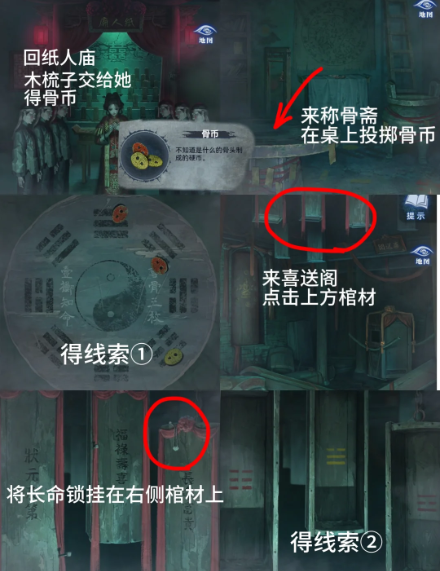 18、回喜送阁,点上方棺材将【长命锁】挂在写了长命富贵的棺材上得到提示,根据两个颜色提示依次点亮左侧墙壁棺材上的图案打开棺材,将【木符咒】插在六藏菩萨木像上得到【一串骨钱】