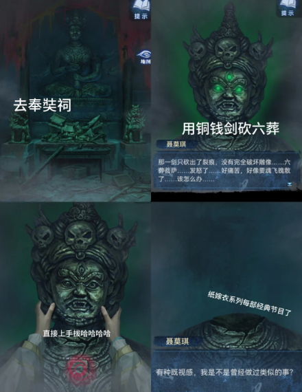 9、进入左侧塔(小高能),点供桌得到【泥塑头像×2】将所有头像放在左边神像上进入小游戏(根据莫黎界面白布形状镜面摆放)