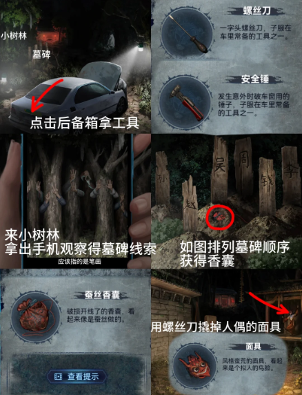 2、点左侧树林用手机看获得提示对应墓牌上姓氏偏旁部首笔划排序【孙赵吴周钱李】获得【蚕丝香囊】