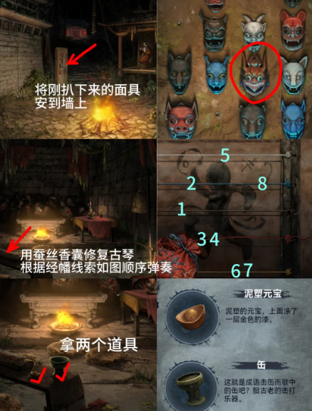 4、进石门,将【蚕丝香囊】里的蚕丝系在左侧古琴上,根据山洞石壁上菜的布条提示弹奏古琴顺序为【黑蓝红红白黄黄蓝】得到【泥塑元宝】【缶】,将【泥塑元宝】放在蛐蛐桌上下注(左右两边都行,最后都会变成平)