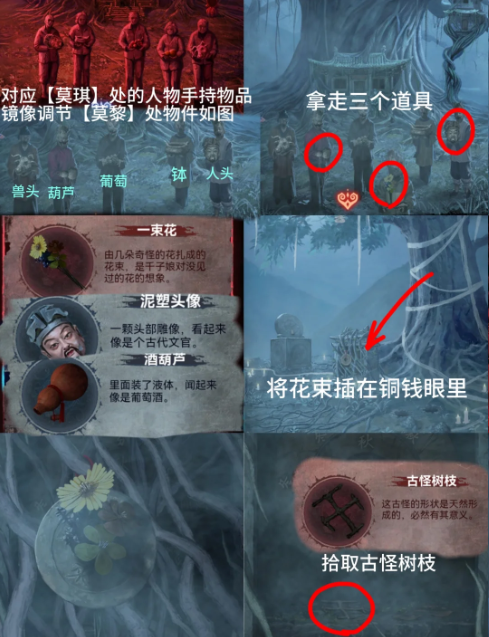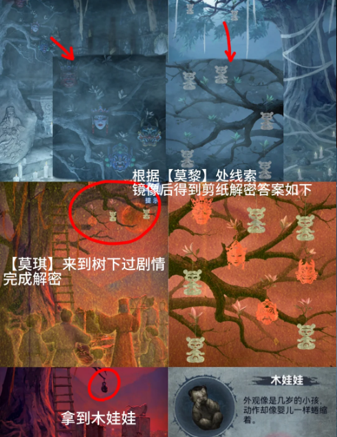 13、切大树场景,点树上,根据莫黎界面树上剪纸和塔内面具线索排放剪纸(剪纸镜面,面具正常放)得到【木娃娃】