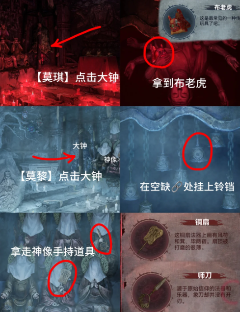 23、点6个神像,将【大铜钱】放在神像上,根据开始的大钟铃铛图案高低依次点击神像【鼓刀钱、官牌木鱼、钱扇】获得【三牲首像】和右侧盘子线索