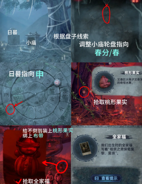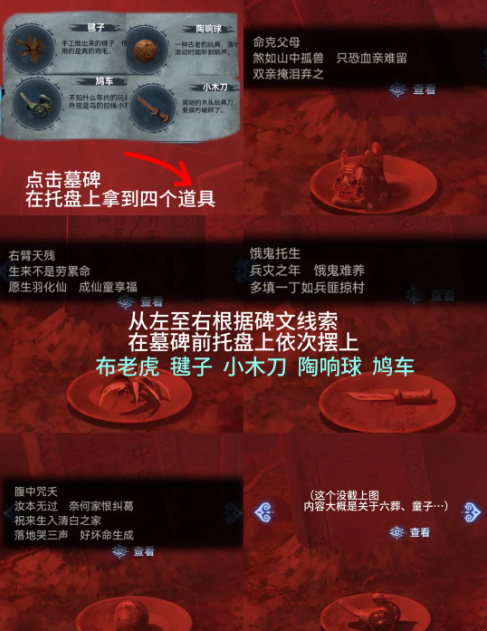 18、进庙钟点击墓碑得到【毽子】【陶响球】【鸠车】【小木刀】再根据每个碑文重新摆放供品:从左到右依次是【布老虎、毽子、刀、球、车】
