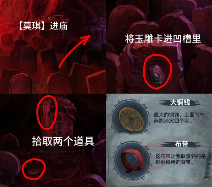29、将【全家福】放进树上荆棘凹槽内得到莫黎【单人照】,将其摆在庙里莫黎墓碑前得到【四根香】,插进供桌香炉里