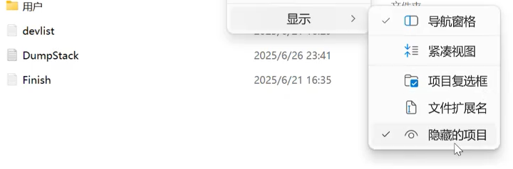 如果你在电脑上找不到对应文件夹,请在查看-显示中把显示隐藏的项目勾选上,如果不勾选的话部分隐藏文件夹就看不到