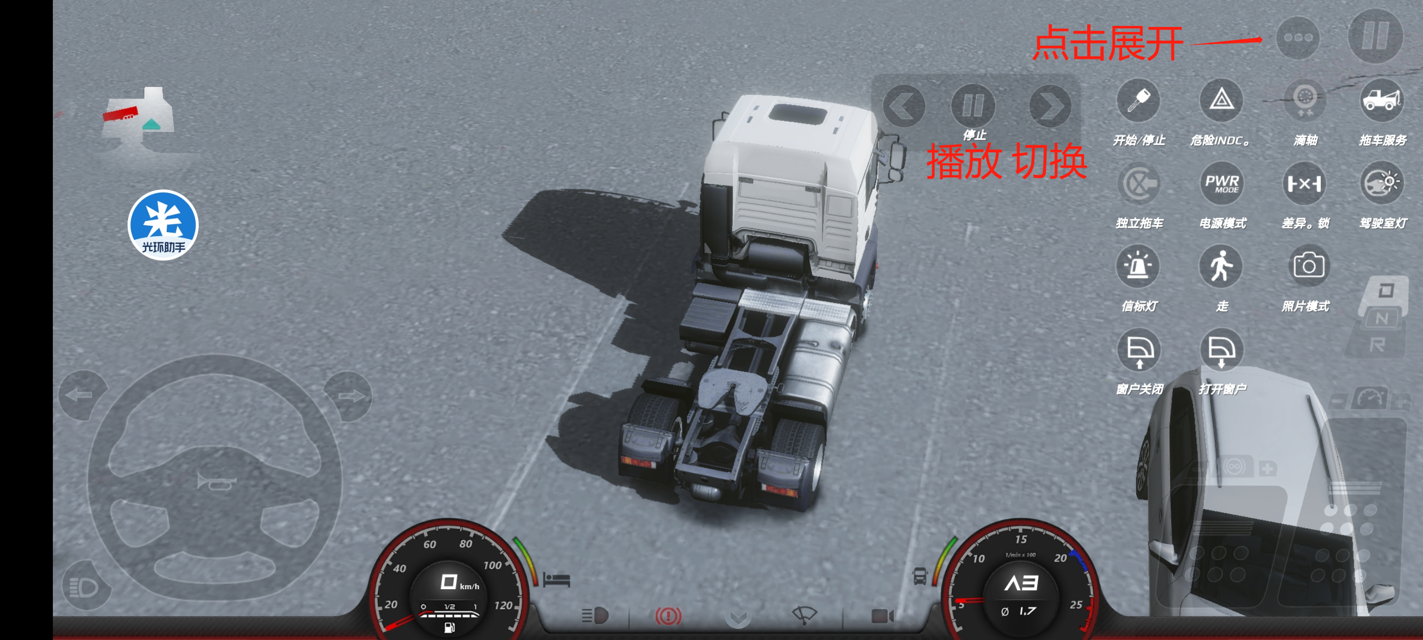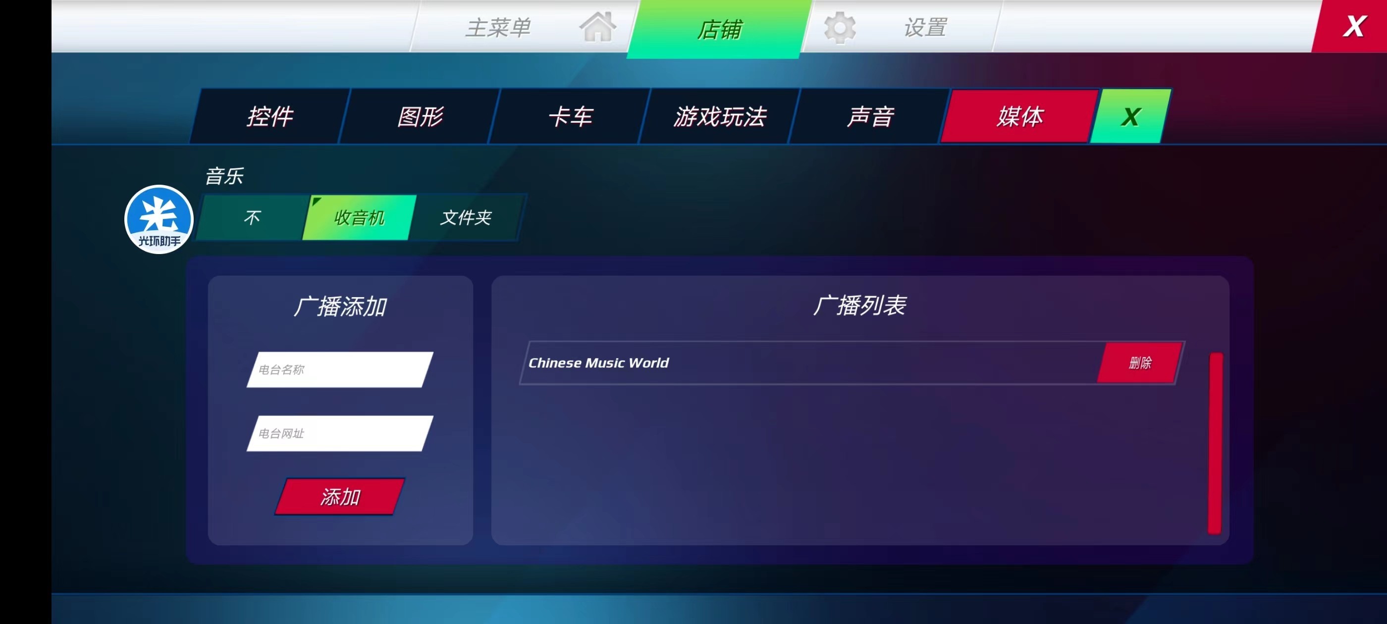 4、选择好你想要播放的电台,回到游戏,点击右上角另外一个按钮后,会展开菜单,菜单会出现播放功能,点击中间按钮即可播放电台,如果你需要更好电台,点击切换即可