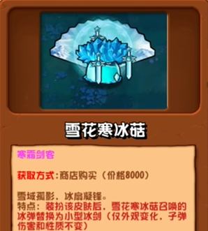 特点:装备该皮肤后,雪花寒冰菇召唤的冰弹替换为小型冰剑(仅外观变化,子弹伤害和性质不变)