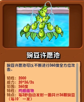 特点:每3秒自动发射一圈共计36颗豌豆(每10°一发)