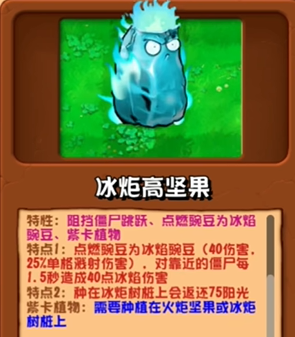 特性:阻挡僵尸跳跃、点燃豌豆为冰焰豌豆、紫卡植物