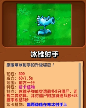 特点:冰锥子弹能穿透最多3只僵尸,无视二类防具,并对僵尸附加减速15秒+5%概率冻结3秒