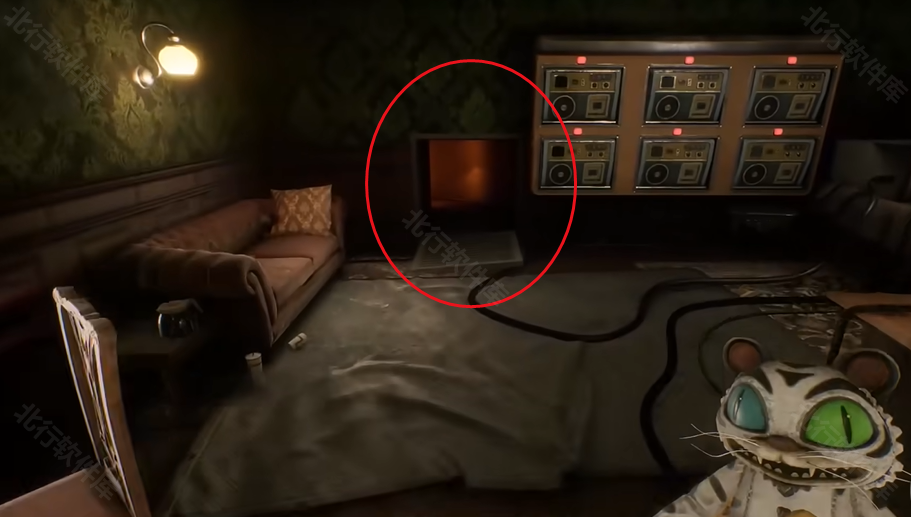 5、从通风管道出来后来到一个隐藏房间,把小白虎放在如图所示的位置(有虎爪标记的柱子上)