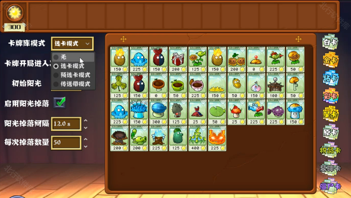可以编辑当前选卡模式、卡牌开局进入冷却、初始阳光数、阳光掉落间隔等。其中预选卡模式就是关卡作者帮玩家选好卡