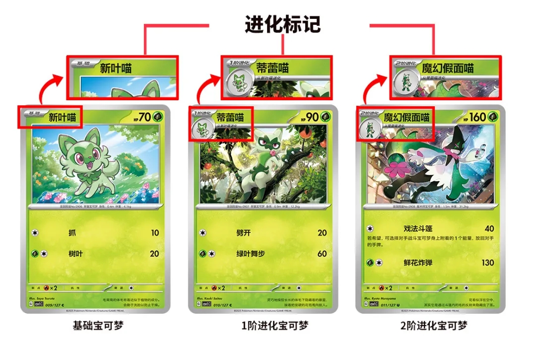 分为基础、1阶进化、2阶进化,以及特殊卡(如V、GX、VMAX、EX)。