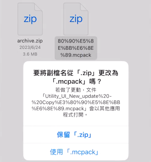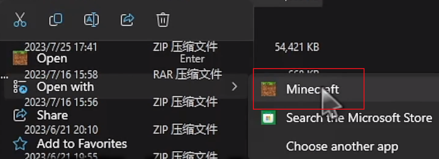 3、将“.zip”后缀改为“.mcpack”,选择打开方式为我的世界国际版