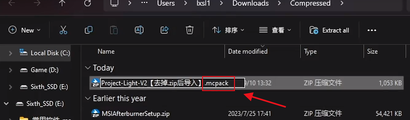 1、找到下载的材质包,同样把.zip后缀改成.mcpack