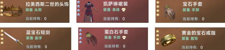 推荐:拉美西斯二世的头饰(1 星)+ 凯瑟琳裙装(4 星)+ 宝石手套(1 星)+ 蓝宝石短剑(4 星)+ 蛋白石手套(4 星)+ 黄金的宝石戒指(4 星,需多个)