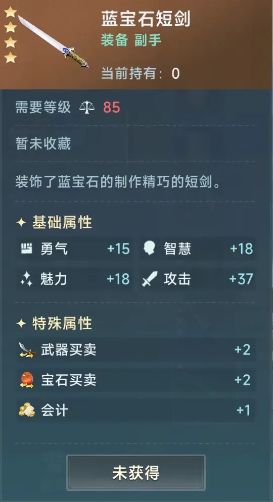 低级装备,升星无技能加成,但仅需金币,收集多后可获 1% 溢价上限,值得升星。(首都海事委托任务获得)