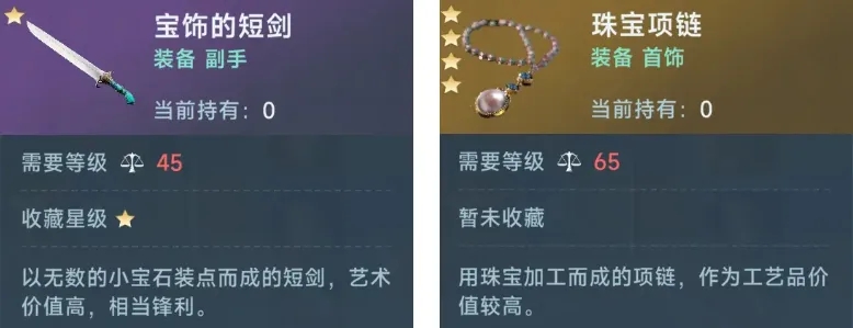 均为过渡装,4 星无技能加成,各留一件即可。(宝饰短剑在坎迪亚郊外冒险获得、珠宝项链在富豪的宝箱或者那不勒斯裁缝处)