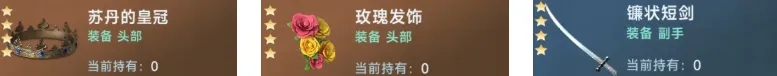 推荐:苏丹的皇冠(4 星)+ 玫瑰发饰(或天鹅绒皇冠)+ 镰状短剑(可升星)