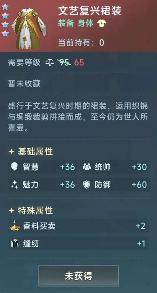 获取难度大,为 1 级纺织品取引升 4 星不划算。(富豪的宝箱获得)