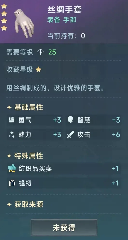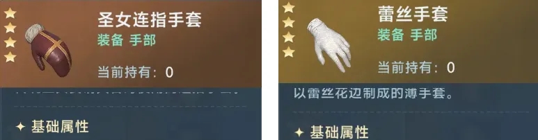 获取难度大,技能加成与付出不成正比,不推荐升星。(连指手套政商宝箱获得,蕾丝手套商人的宝箱获得)