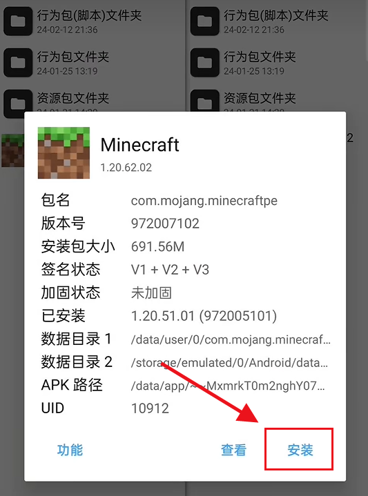 2、打开MT管理器,找到MC安装包,点开后选择“安装”