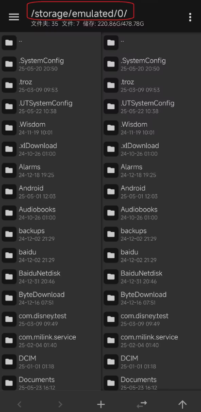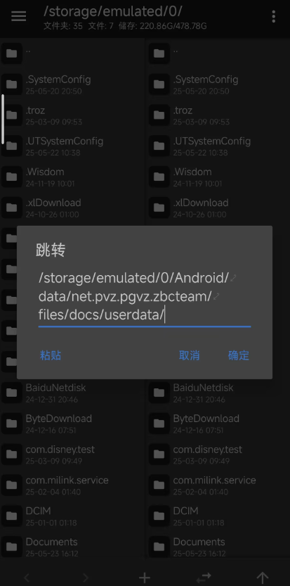 2、然后将/storage/emulated/0/Android/data/net.pvz.pgvz.zbcteam/files/docs/userdata/复制粘贴到地址栏,按下确定即可进入存档文件夹