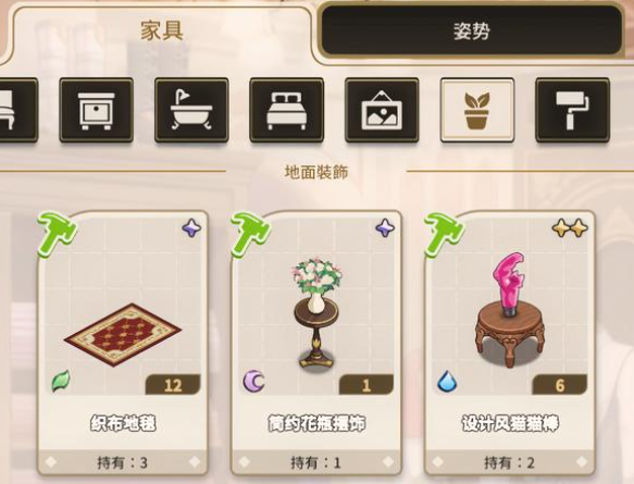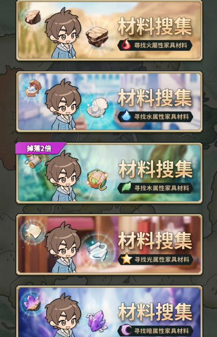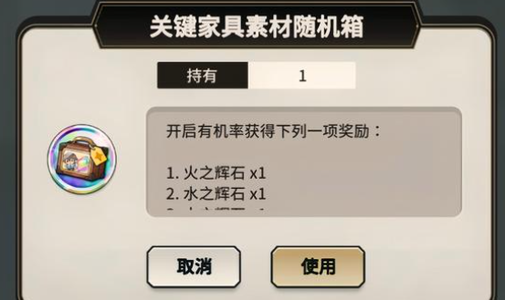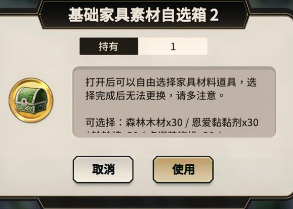 4、平常制作家具的基础材料不够的话可以去仓库看一眼,平常打活动会给有金紫白三个颜色的素材盒子(有随机有自选,种类分成两半为1/2)初阶材料则不分(消耗区域通行券的材料)