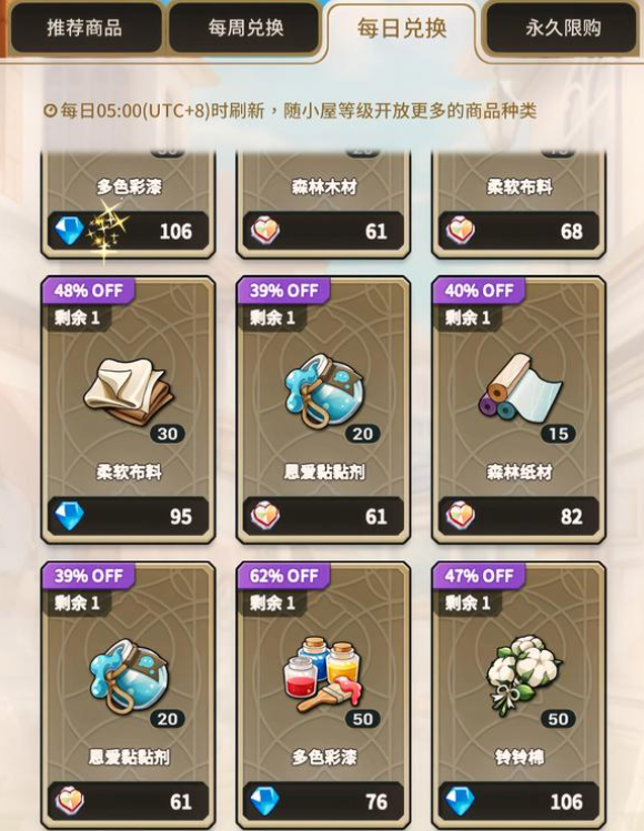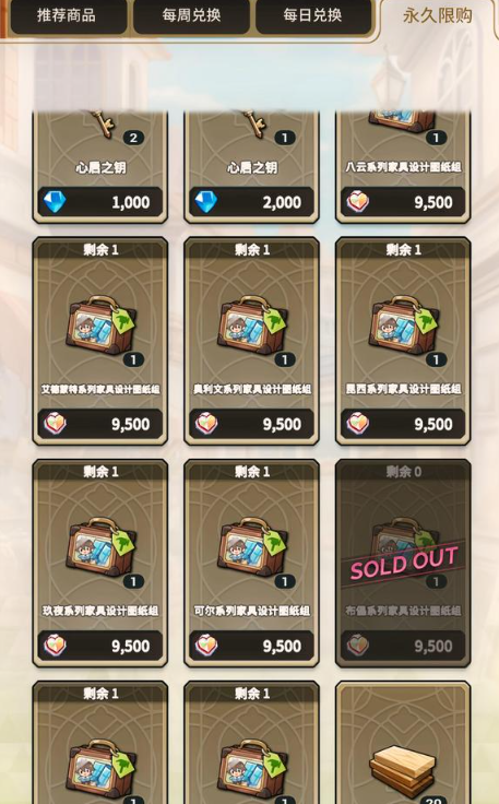 1、永久兑换里可以兑换你喜欢的角色的家具图纸(不包含氪金和活动本家具图纸)这里也有开启多个房间的钥匙
