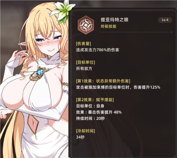 大招:本身比率略低,但是配合木弓之后增强了不少,并且释放后有一个20秒的超级增伤buff。再配合3(增加自身魔攻),4(增加爆伤和爆率)两个增伤被动技能纯纯的数值怪