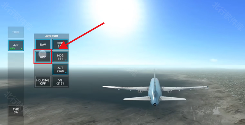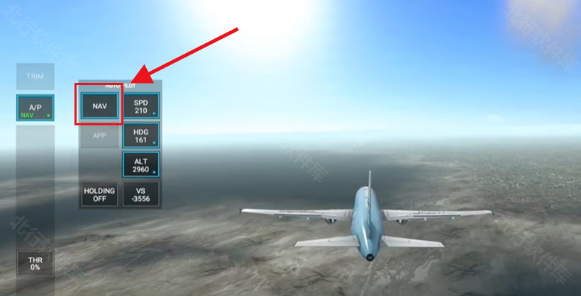 1、飞到降落点后,点击A/P打开NAV(自动驾驶),让自动驾驶操控飞机降落