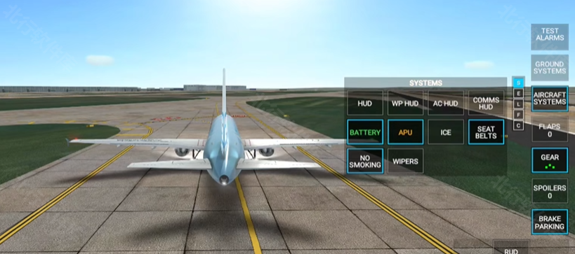 10、打开APU来到地勤面板,找到指引车,点击后指引车就过来帮我们指引到停机位。然后点击TAXI跟着指引车走就行了