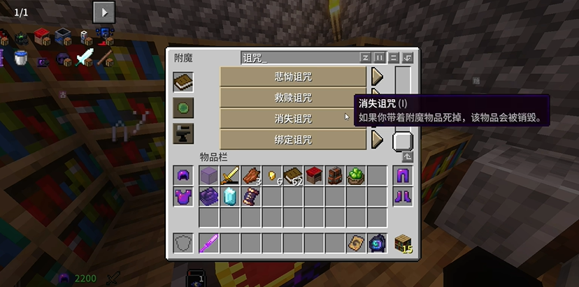 3、举个例子,这里要附魔诅咒,就在上方搜索【诅咒】,诅咒一般附魔“消失诅咒”和“绑定诅咒”