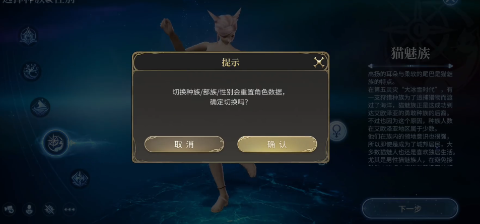 3、之后就能重新编辑角色,这里提示切换种族会重置角色数据,重置的是角色外貌数据,练的职业等级都还在