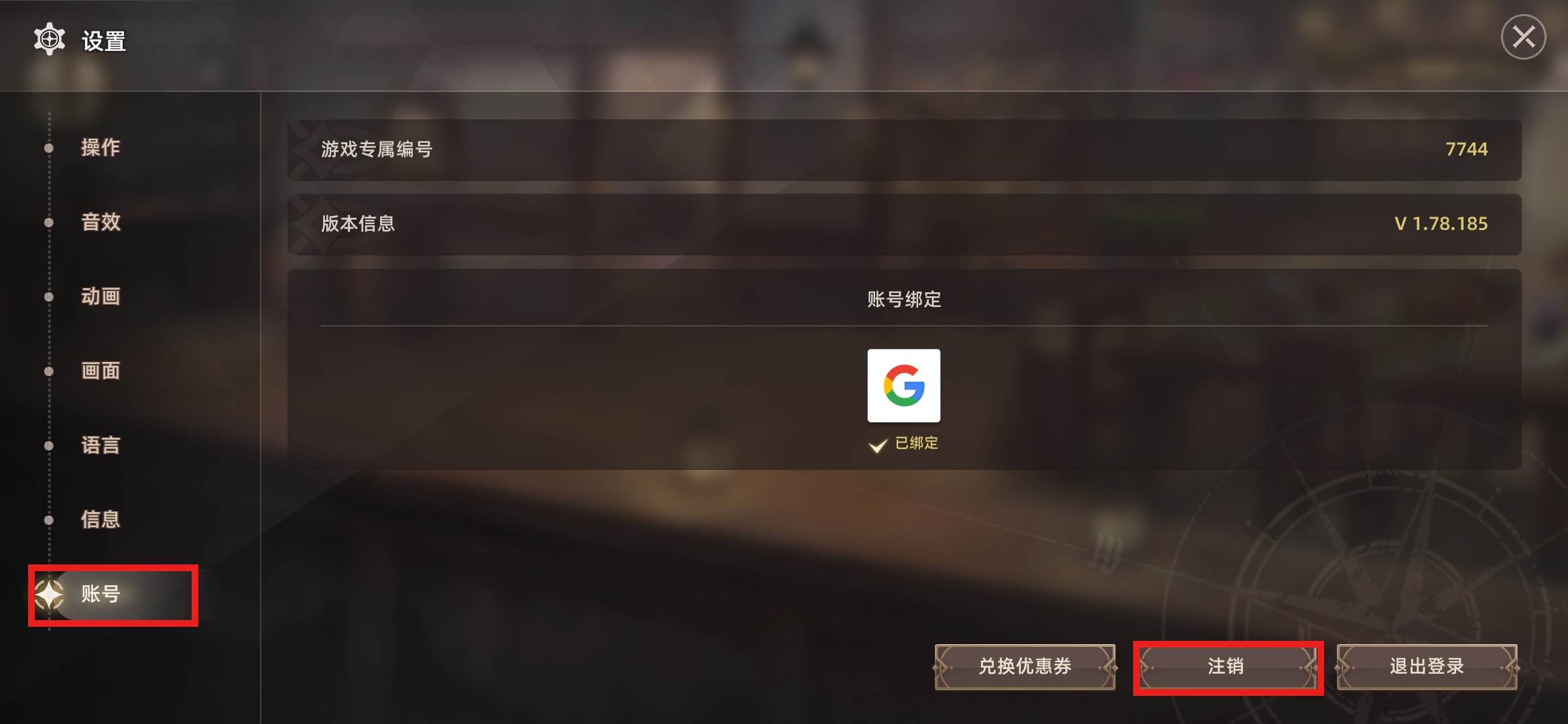 2、进入设置界面后,点击账号,再点击下方的注销按钮,即可对游戏账号进行注销