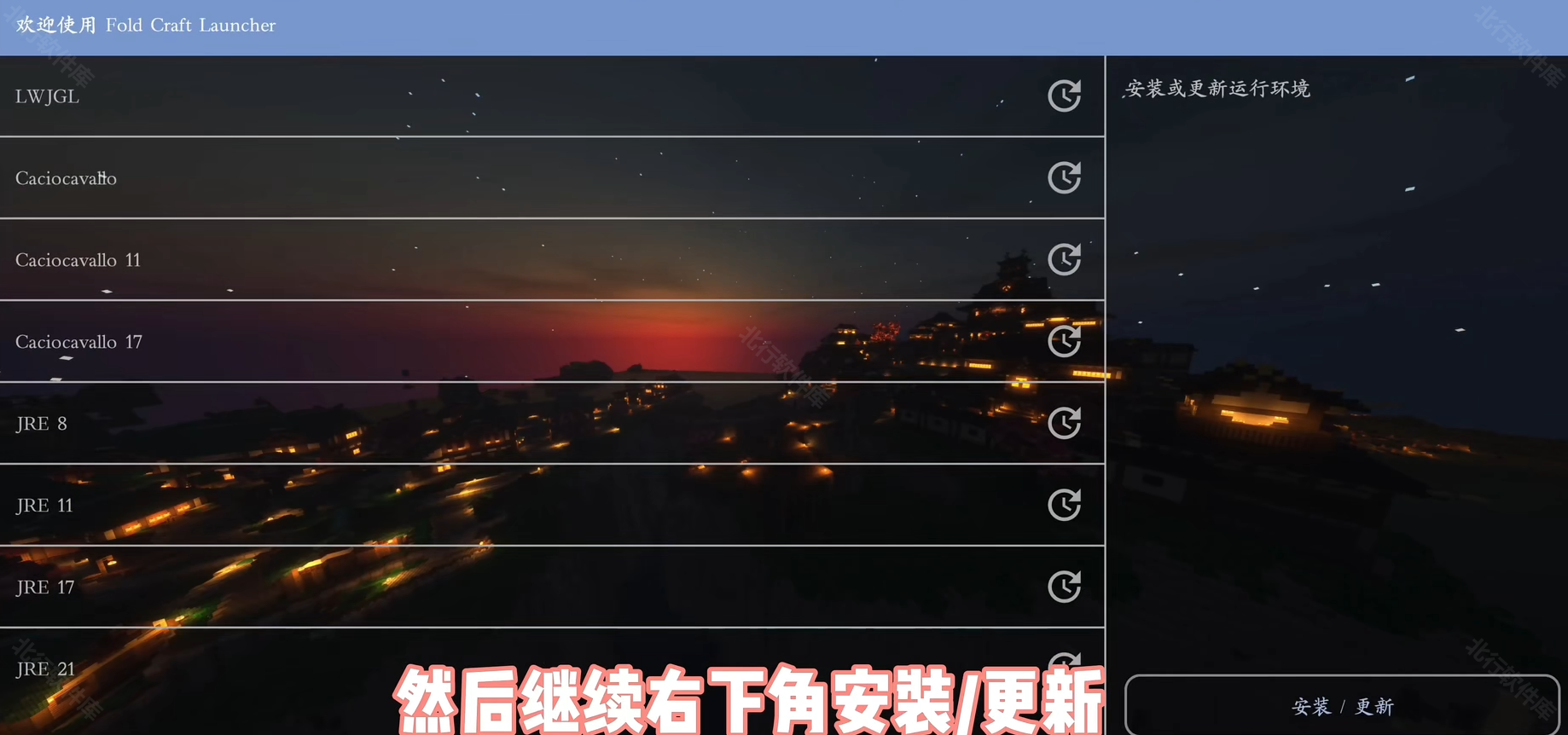3、右下角同意并继续→安装/更新,这里是释放整合包内容,并检测运行环境。如果运行环境有缺失则会下载并安装缺失文件