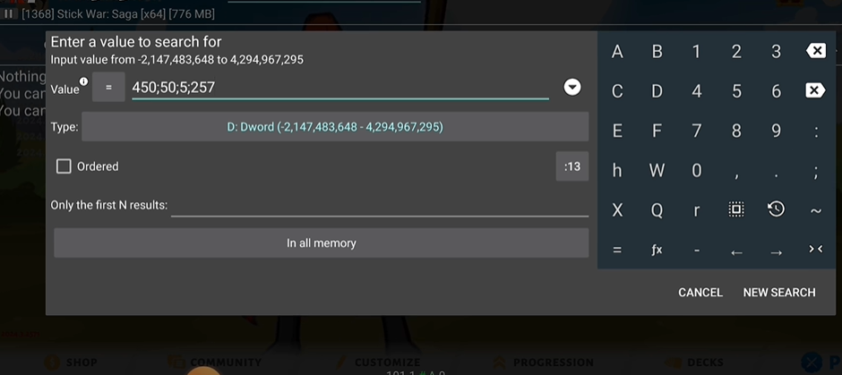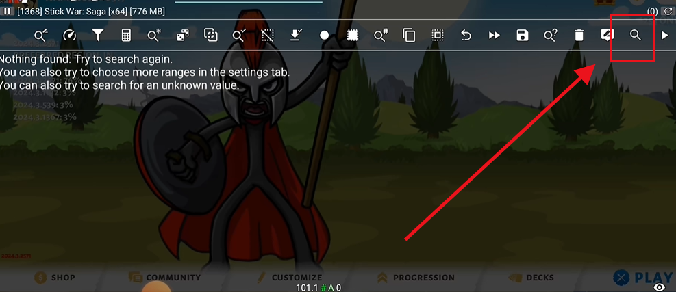 1、启动火柴人战争遗产3并打开gg修改器,点击右上角的搜索