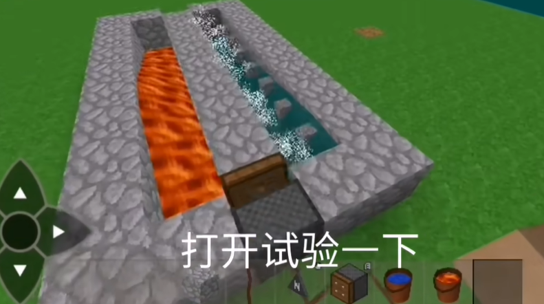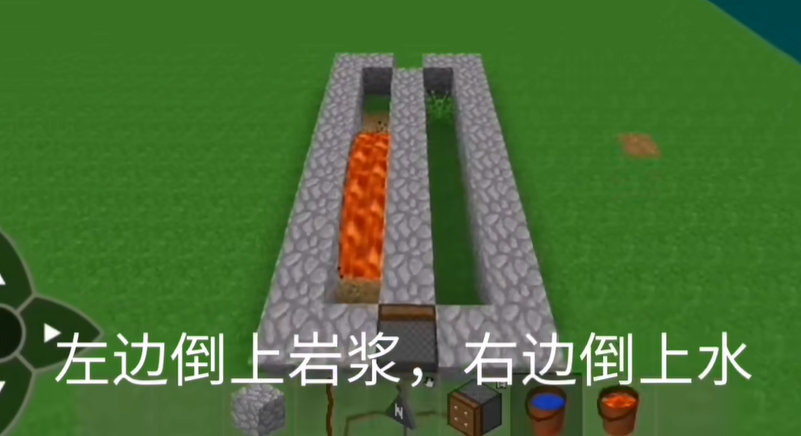 注意:东南西北方向不难反,装置一定要东西朝向,北边倒岩浆,南边倒水,方向反了就无法刷石头
